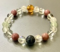 ★サイズ(15センチ)★ ●サファイア(10ミリX1) ●クラック水晶(8ミリX6) ●ロードナイト(8ミリX4) ●プレナイト(8ミリX2) ●オーロラクリスタル(8ミリX2) ●琥珀(10ミリX1) ●水晶(8ミリX6)