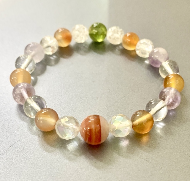 ★サイズ(15センチ)★ ●ペリドット(8ミリX1) ●サードオニキス(10ミリX1) ●クラック水晶(8ミリX6) ●アメジスト(8ミリX4) ●サードオニキス(8ミリX2) ●カーネリアン(8ミリX6) ●オーラクリスタル(8ミリX2)