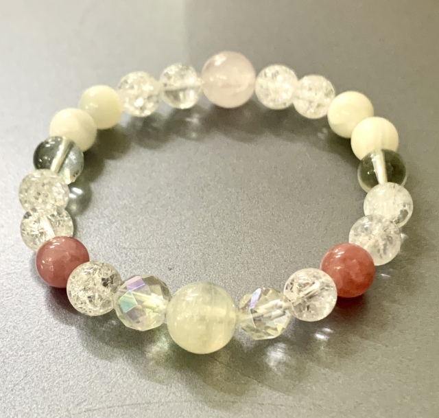 ★サイズ(15センチ)●ブルームーンストーン(10ミリX1) ●オーロラクリスタル(8ミリ×2) ●クラック水晶(8ミリX10) ●インカローズ゙(8ミリX2) ●フロ-ライト(8ミリX2) ●マザーオブパール(8ミリX4)●ローズクォーツ(10ミリX1)